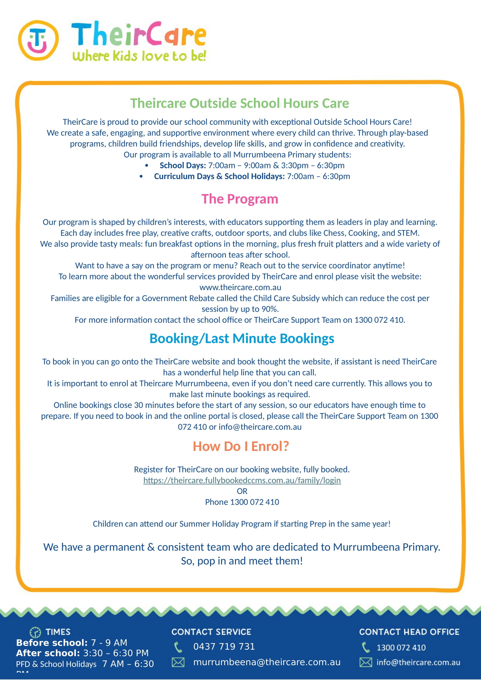 Our school has partnered with an independent provider TheirCare to provide Before, After Care and Holiday Care services to our school community.