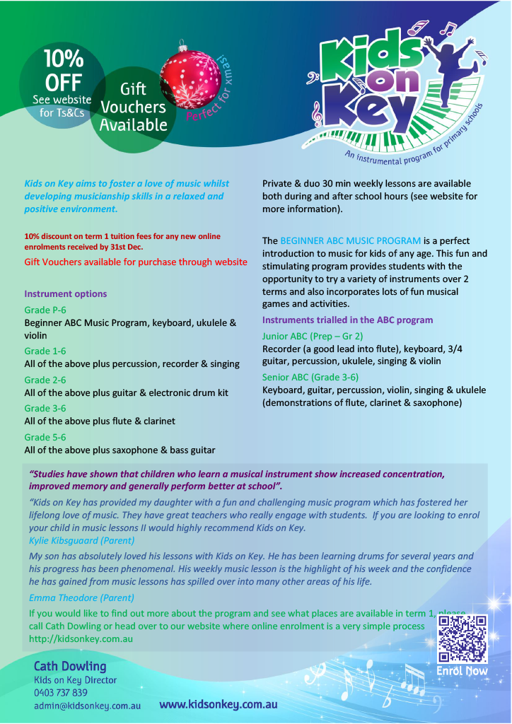 Kids on Key offers high quality, affordable music tuition in a range of instruments during school hours. We make lessons fun and engaging for all students and cater for all levels and abilities. Please click here to find out more: Murrumbeena Primary - Kids On Key.
