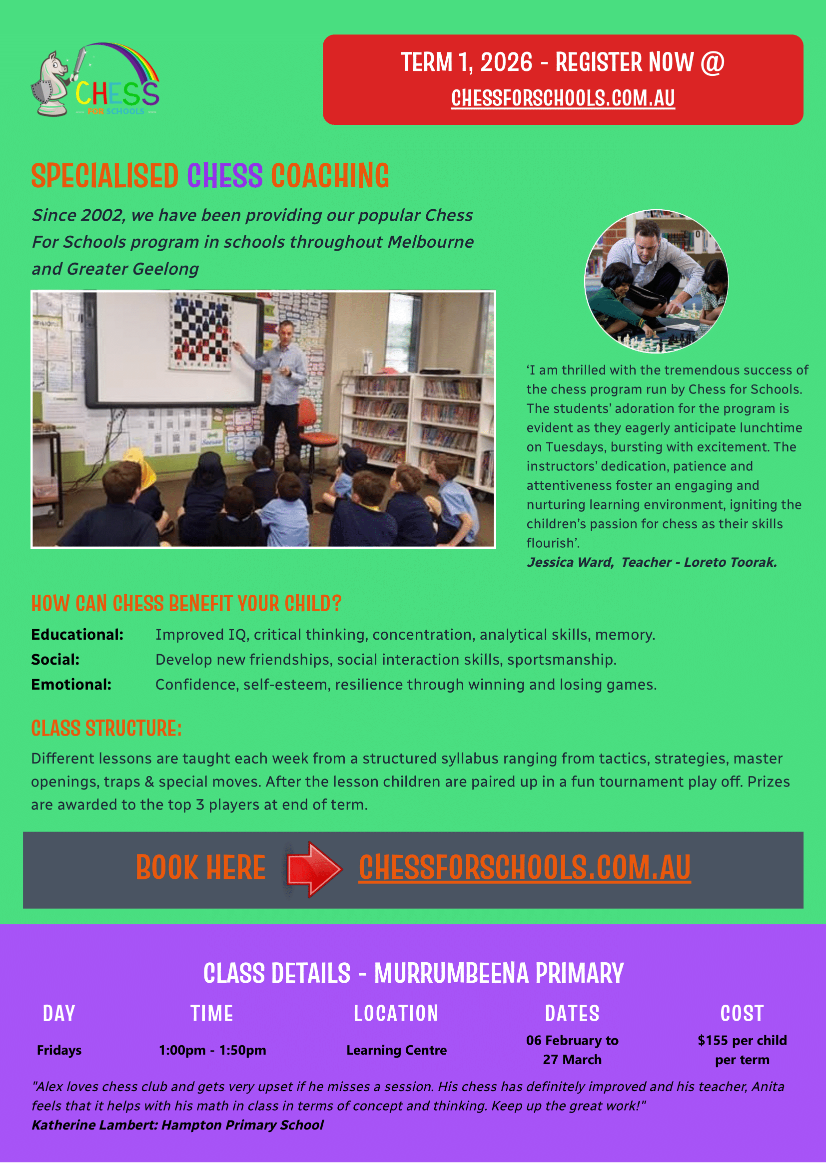 Join the ‘Chess for Schools’ team at Murrumbeena Primary as they teach weekly lessons from a structured syllabus while setting up a fun tournament play off. Trophy and badge prizes are awarded at the end of the term to the top three players.