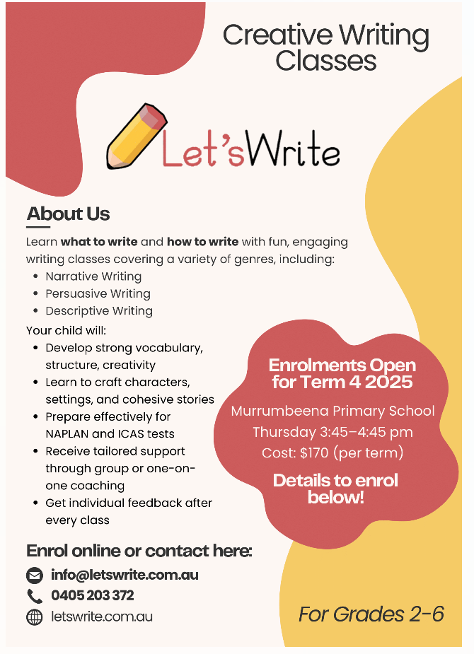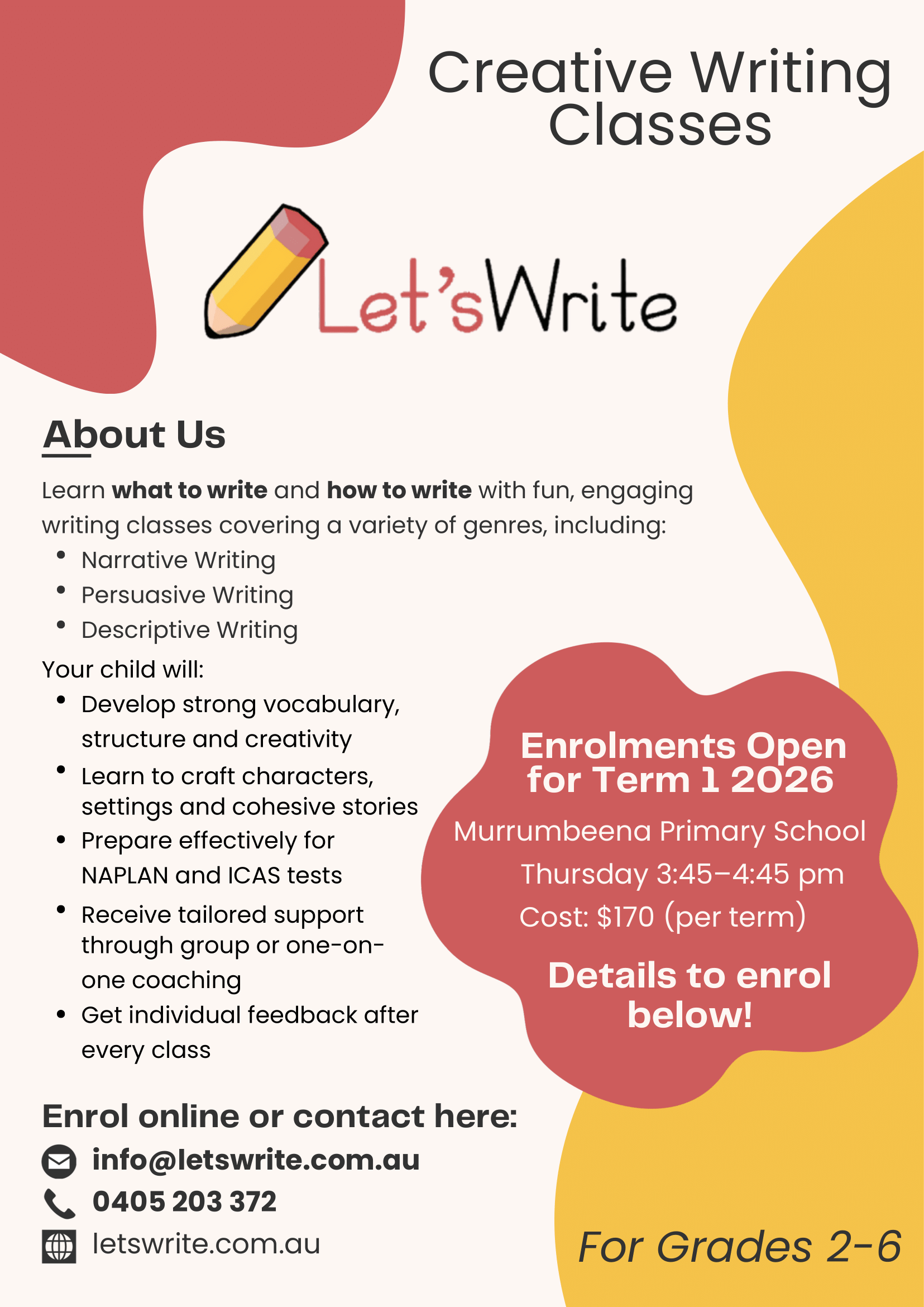 ‘Let’s Write’ is an after-school creative writing program that develops creative thinking and writing skills in a fun and positive atmosphere. Our classes run throughout the year. Our objective is to enable children to develop and explore their writing skills in their own unique way. Spelling and grammar which is an integral part of writing is also covered in the program. Not only do we encourage children to experiment with different genres but also encourage them to complete timed writings.
